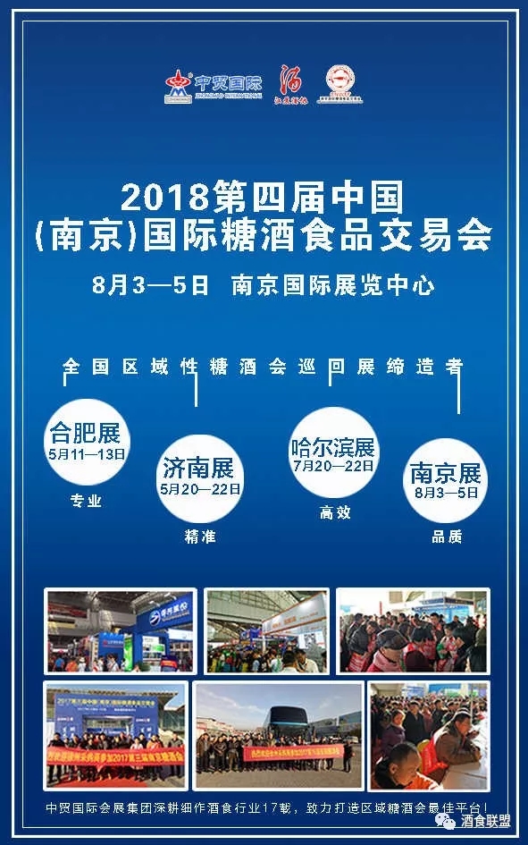 中貿(mào)集團(tuán)2018年計(jì)劃將在山東濟(jì)南、安徽合肥、江蘇南京、黑龍江哈爾濱、浙江杭州等省市舉辦十余場次酒博會、食品展、餐飲展,形成聯(lián)動(dòng)招商、資源互動(dòng)和共享。